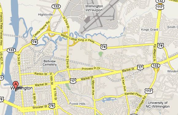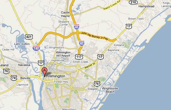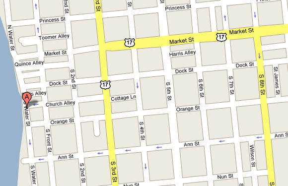 | From South US-17: Turn LEFT onto NC-133. 0.4 miles Go STRAIGHT toward WILMINGTON DOWNTOWN. <0.1 miles Stay STRAIGHT to go onto ramp. 0.1 miles Merge onto N 3RD ST. 1.1 miles Turn RIGHT onto DOCK ST. 0.2 miles Turn LEFT onto S WATER ST. <0.1 miles You're Here! | From North US-17: Merge onto US-17 N / US-74 E / US-76 E / ANDREW JACKSON HWY toward WILMINGTON. 2.8 miles Keep LEFT at the fork to go on US-17 BR N / US-76 E. 1.5 miles Turn LEFT onto S 3RD ST / US-17 BR / US-421. Continue to follow S 3RD ST / US-17 BR. 0.7 miles Turn LEFT onto DOCK ST. 0.2 miles Turn LEFT onto S WATER ST. <0.1 miles You're Here! |